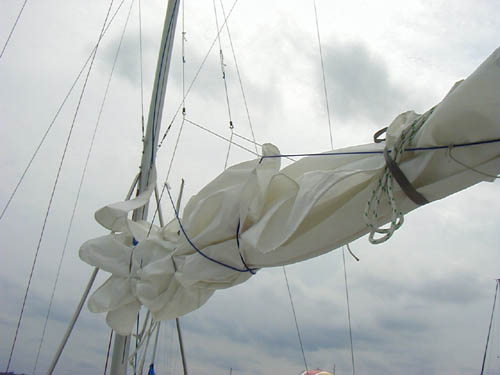 There are two parts: the cradle that holds the sail when it drops, and the support lines which tie off to the spreaders.