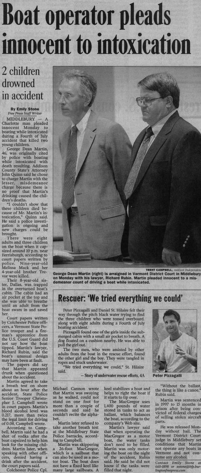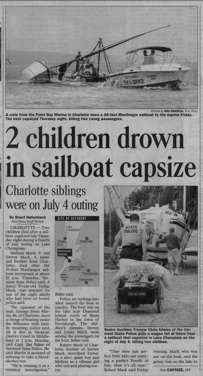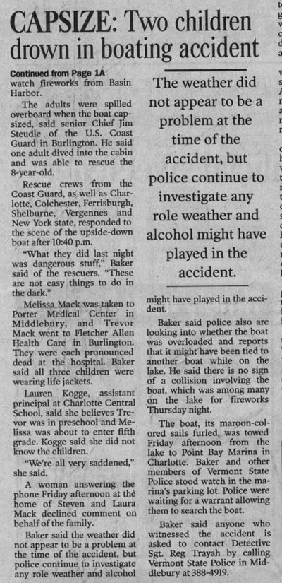 The boat capsized about 10 p.m. on Lake Champlain in Ferrisburgh. Nine-year-old Melissa Mack and her 4-year-old brother, Trevor, drowned. The accident left the community wondering what caused a boat on calm waters to suddenly capsize.