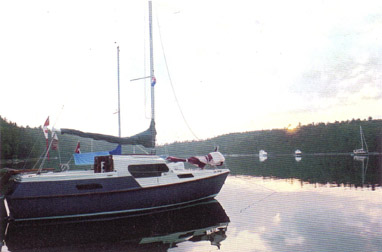 The group sailed north to the North Channel above Kilarney and Little Current. A fitting end to the story is a picture of "About Time" at anchor at sunset. |