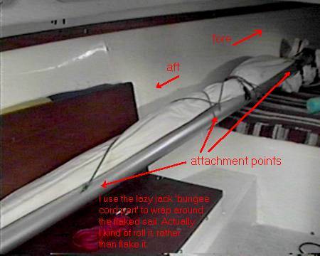 The close up shows my 'attachment' methods. No fancy boom bail here- just some plain vanilla copper wire (stripped 12 ga romex) that I formed in a big loop and snaked into the holes, with the 'knot' inside the boom. Then I formed them into loops that I tie the 3/16 shock cord to. These copper things swivel a little, and when the lazy jax are down, the 'swivels' point to whichever side is tighter, and everything sits about flush with the boom. Call me lucky, call me a crackpot, it makes no difference. My wife thinks I'm a %#@!$&% Genius.