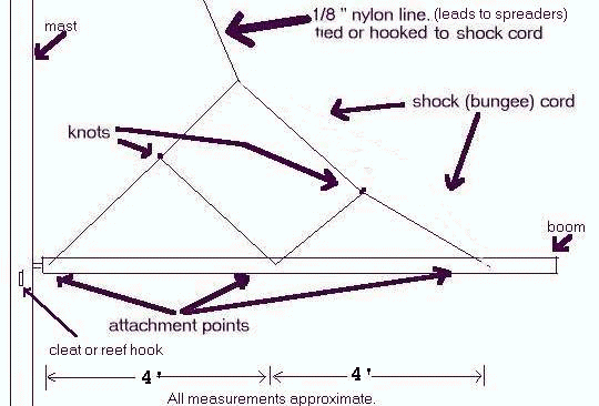 The drawing shows the basic layout. In brief, you go from attachment point to attachment point, keeping the shock cord snug, mebbe a little tight. Then you tie little loops in the midpoint of each section, and tie another piece of shockcord between these two loops, and in the middle of this section tie a little loop, which you'll use to tie the hoisting lines to. The hoisting lines (1/8" nylon) lead to cheap tiny hardware store blocks (tip: when in Rome, call them by their other name: "pulleys") that I hooked to the 'spreader dogs'. Decide for yourself if I made that last nautical term up. (Vote here.) I already had a cleat right below the gooseneck, which is what I loop the hoisting lines around when the thing is down and slack. Sorry I don't have a good picture of the whole rig up in action- maybe later.