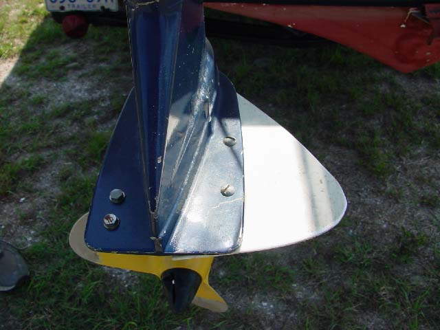 Here is a picture of a simple device that will prevent the propeller from turning into a rudder shredder. This is a photo of the device on Mike Morris's V-23. The added fin is made from an old 18 wheeler plastic mud flap. A 1/4 piece of plywood would also work. It just keeps the rudder and the prop from shairing the same space.