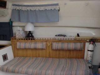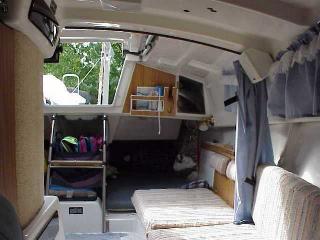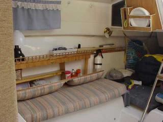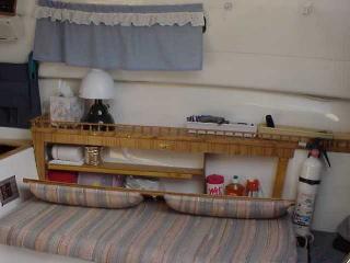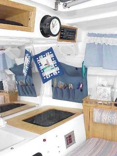 Modifications to the galley area include removing the propane stove the previous owner installed and covering the hole with a finished plywood top with a hole custom fit to an ice chest for day sailing. There is a silverware bag hanging on 2 inch diameter suction cups, curtains, radio/cassette deck, storage compartment next to the chronometer (a Christmas Present last year from my First Mate!).