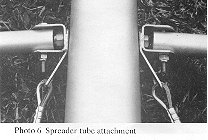 Connect the spreader tubes to the U shaped brackets as shown in Photo 6, using 1/4" x 2" bolts and lock nuts. The nuts go toward the bottom end of the mast. Run the nuts down just snug enough so that the spreaders can pivot around the bolt with a slight amount of friction.
