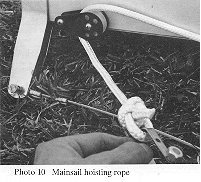 The rope that hoists the rear (main) sail passes through the pulley at the masthead (Photo 10) and the forward end ties off to the cleat on the right side of the mast (right when looking forward). Use a bowline knot and tie a twist pin U shackle to the aft end of the hoisting line (the end nearest the sail feed track)