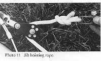 The rope that hoists the forward jib sail passes through the pulley near the top of the forward mast support wire and ties off to the cleat on the left side of the mast. Tie a twist pin U shackle (with a bowline knot) to the forward end of the hoisting rope (Photo 11).