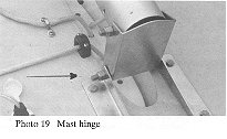 The top part of the hinge always remains bolted to the bottom of the mast. The bottom part of the hinge always remains bolted to the deck. The 3/8" x 4 1/2" bolt and locknut that secured the mast base to the forward rail is used as the hinge pin. Insert the hinge pin (see Photo 19) and make sure the lock nut is on tight enough that the plastic seal engages the threads. (You will need two 9/16" end wrenches for this.) It is not necessary to run the nut down tight on the hinge plates. Just make sure the nut is on tight enough so that you can't turn it with your lingers.