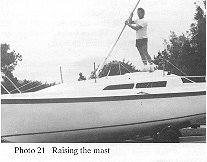 Make sure that the mast wires are not entangled on the boat or trailer, and then raise the mast. This is best accomplished by standing on the cabin top, aft of the mast, and lifting the mast into position. Be careful not to hit a power line with the mast or rigging. You could be injured or killed.