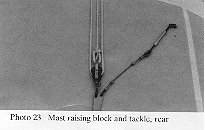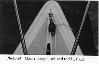 Hook up the 3 part block and tackle between the forward wire stay and the nose of the boat. Using the small screw pin "U" shaped shackles, connect the blocks to the triangular stainless steel plate on the forward wire stay and to the rear hole in the stainless deck plate as shown in Photos 23 and 24. The pulleys are not identical. Make sure they are installed as shown. Make sure the small pins in the U shackles are screwed down TIGHT.