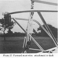 Pull the rope tight, and tie the end securely to the cleat on the forward deck. Now connect the bottom end of the turnbuckle to the forward hole in the stainless steel fitting at the nose of the boat as shown in Photo 27. Look up at the rig to make sure that none of the loops in the wire ends are kinked or hooked over the stainless steel fittings to which the wires attach.