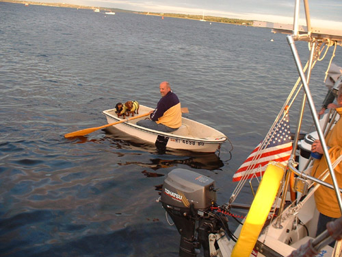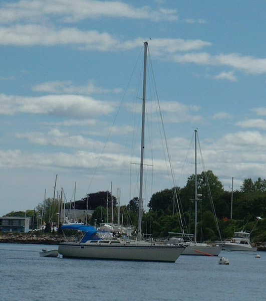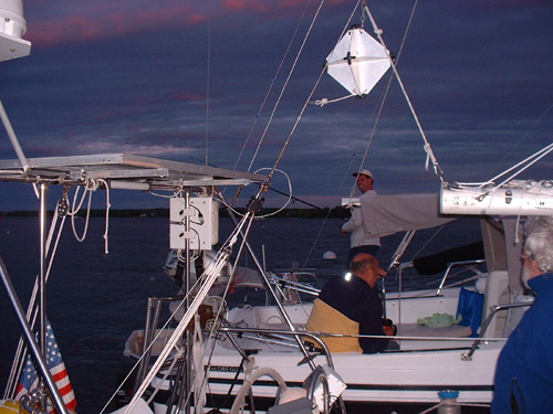 We got to the ramp by mid afternoon - no rain yet - so we rigged and put the boat in the water. Mark got to meet some of the other members and got to see some of the other boats. Then we helped Mike Welch rig and Dan and Nancy too. Ed, Tony and Jack came in - back from delivering Jack's new boat, a 39' Oday named Dror, (Her name means both "freedom" and "sparrow", her former name, and is pronounced as written.) to her mooring in Pirate Cove on the Sakonnet River. We went out for dinner and got back to the boats around 9:30. Still no rain.