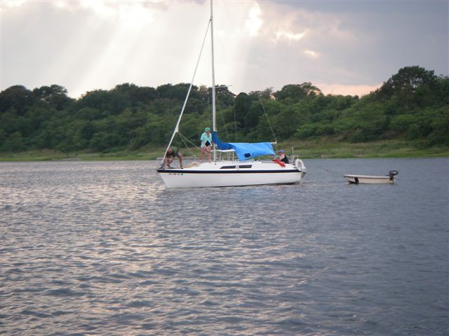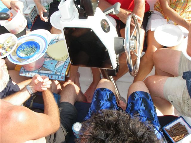Rani had a different take on things: We anchored "Dror" for the first time , without a functioning depth gauge, and didn't drag our anchor! Thanks to Ed on "Dolphin" for playing depth gauge and overseeing our anchoring.(He really just wanted a big boat to raft up to.) We really enjoyed having all the visitors, and being able to host people. The boat never felt crowded