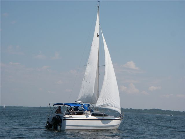 So Sunday dawned beautiful, with a light wind. The wind died and we motored to the south end of Prudence Island. We had a little wind - enough for Ken to make this comment: A Corsair is supposed to be a fast boat, but in 3 knots or less wind, we're as slow or slower than a MacGregor, and my 8 hp motor is no match for the 50's you guys have.