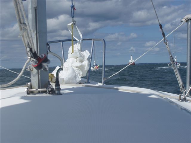 The Ledge was our 10 am rendezvous location where we hoped to join up with the first group of early bird boats. We had our main and jib set and tacked in that general direction. We guessed the wind was about 12 knots. We had 1-2 ft waves, the largest I had ever navigated. Yet, the Gypsy Moon was handling the chop just fine.