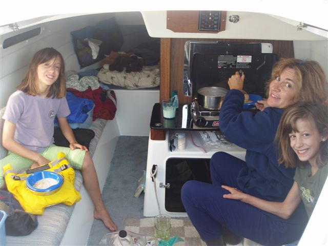 Andrea took total charge of Julia and Galena and kept their spirits up. She got the girls out from below before they turned green. However, pulling them up on deck had the disadvantage of their being able to see what was ahead of us. Andrea guided their energies and got them to see it as a game! "See the Buckaroo ride over that wave? Taya and Mya are doing it; we can too. It's like a roller coaster, and here comes our ride, wow"! It worked. Mom got her kids to actually see it as fun and enjoy it.