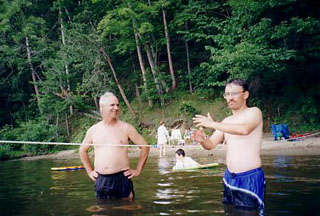 At Deep Bay Carol, Willy, Don Huff, Steve and Tabby Silvia, and I hiked through the woods taking several wrong turns on the way over to the swimming beach, it was crowded, hot, and muddy! We would have been better off swimming from the boat or shore in Deep Bay, which is what others did. In a south wind Burton Island is only a short sail on a reach from Deep Bay, and most arrived by 12:30 or 1:00, depending on drawbridge timing. It was another scorcher and swimming was again high on the list of preferred activities. That evening we got together for a potluck picnic and later music and singing. Pam and Bruce (Charis) caught up after flight delays caused a late start for them.