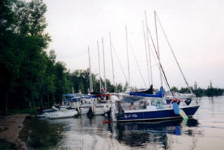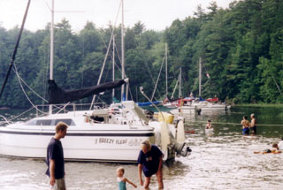 The rest of the day was devoted to swimming, a campfire, and music and singing. Bill Brock brought a guitar, harmonica, and a bag of kazoos, Bob his fiddle, and Carol a penny whistle. Thursday, Roger and Barbara after having listened to an ominous weather forecast of thunderstorms, got everyone going early for the trip to Malletts Bay. 3 Breezy Fleas and Puddlehopper dawdled over breakfast before being the last ones to leave. We wound up motor sailing through 2-3' waves and keeping an eye on black clouds passing to the north. However, we always were on the edge of the weather, only hearing occasional rumbles of thunder and seeing lightning in the distance. We anchored on the north shore of Malletts Bay and settled in for an afternoon of swimming. The Kerwins on Buckaroo joined us here. In the evening there were fireworks all around the bay.