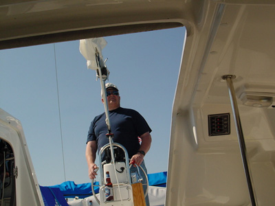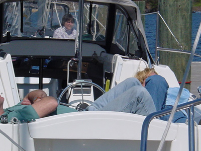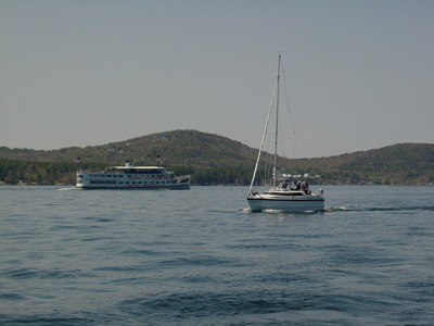 Saturday night wasn't quite as cold but there was frost on the cushions on Sunday morning. Don Huff and Ed's son Ted joined us for the "sail" on Sunday - this time to Wolfboro for ice cream. The day was warmer and again no wind. There were more boats on the lake so we couldn't get near the docks for our ice cream. We had some wind on the way back and thoroughly enjoyed the warm sun and clear skys.