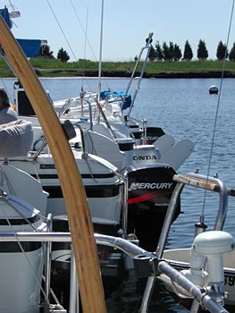 We rolled in around 6 pm Friday and were greeted by Ed, Tony, Barbara, Al, Karen and Roger. Paul with his slick looking blue 26M was in the warm up lane. A yellow 26x, the distinctive Nuomenon owned by Jim and Venessa, rested by the courtesy dock. Although we had intended to launch friday night, we decided to sleep in the boat and launch early in the morning.